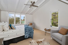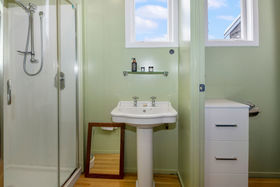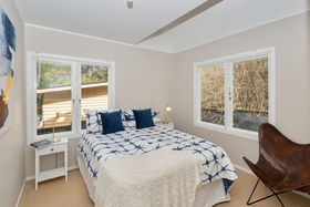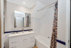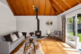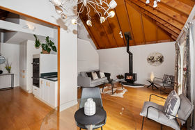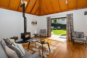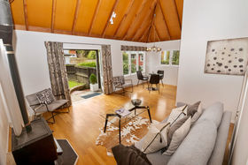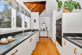 Enter into a generous galley kitchen, with oodles of storage and bench space. The dining and lounge is modern and contemporary, with cathedral ceilings, a wood-burner and French doors opening to the fully fenced garden. In fact the there is garden front, side and rear, catching the sun and allowing kids and pets safe play. The ground level has two well-appointed bedrooms, both with internal wardrobes. The master bathroom is also on this level, offering shower over bath, and the laundry neatly tucked away behind louvre doors.