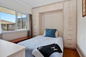 The master bedroom is well-appointed with floor to ceiling wardrobes and a courtyard view. The second bedroom is a triumph of design. Fitted out with a 'pull-down' queen-size bed, this is a utility room at its finest. By day a functional office or study, and by night the perfect guest bedroom.